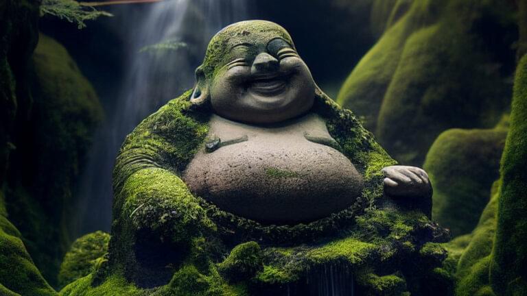 Okay, imagine a male deity, sitting cross-legged on a rock, engulfed in flames. The flames symbolize consuming all the evil in the world. Now his skin is dark indigo or black. He’s scowling, brow furrowed. One fang pointing up, one fang pointing down. He’s also got a squinty left eye and a long braid hanging over one shoulder. He’s holding a sword in his right hand that symbolizes cutting through ignorance and delusion. While a rope or a lasso is in his left, it is with this that he ropes in violent passions and evil. Fudō Myōō is hardcore. He’s also known as the Immovable One.
